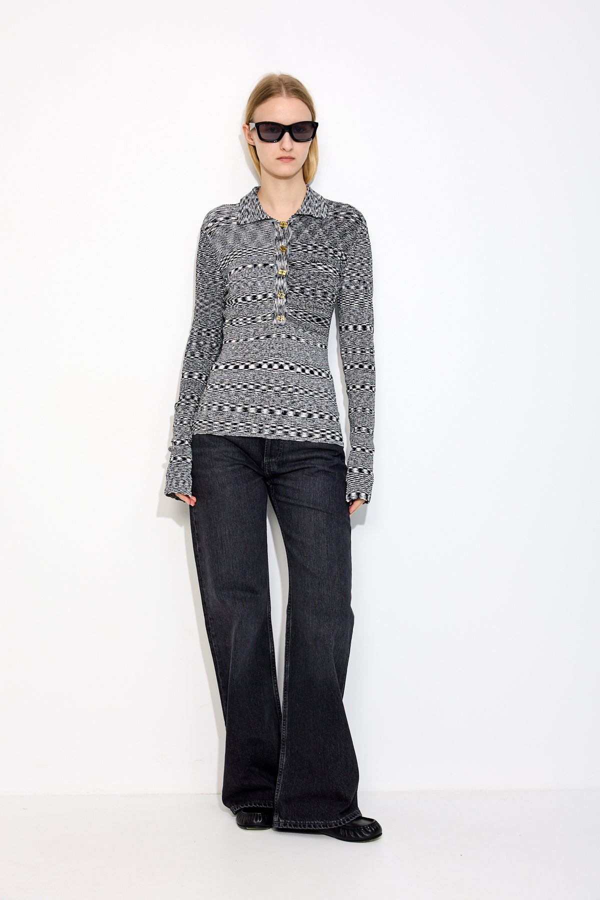 בגזרה צמודה לגוף, כפתורים מזהב עם לוגו המותג באיזור החזה