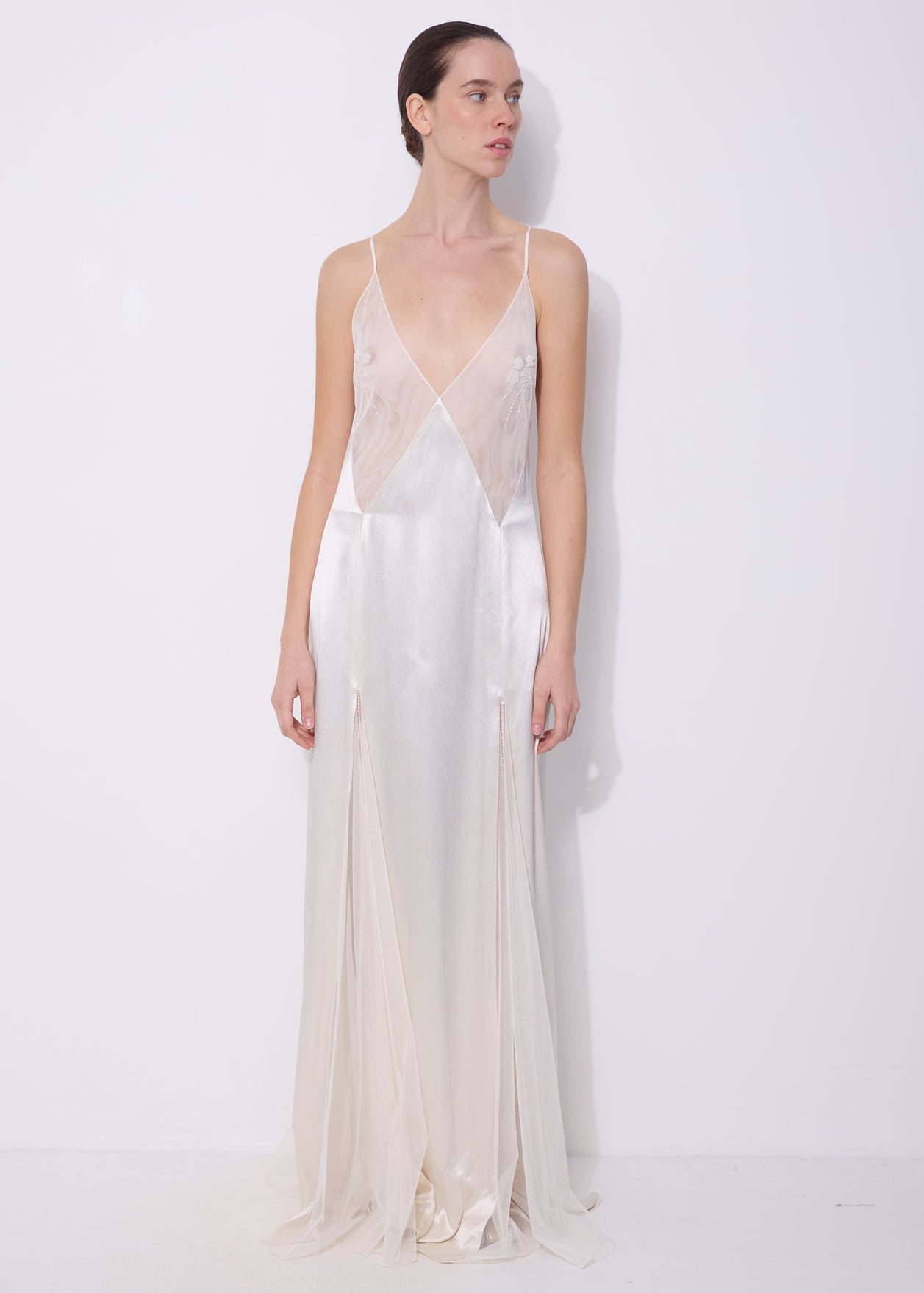 עשויה מבד סאטן מבריק ונעים בצבע שחור,  בשילוב פאנלים שקופים בחזה ובחלק התחתון